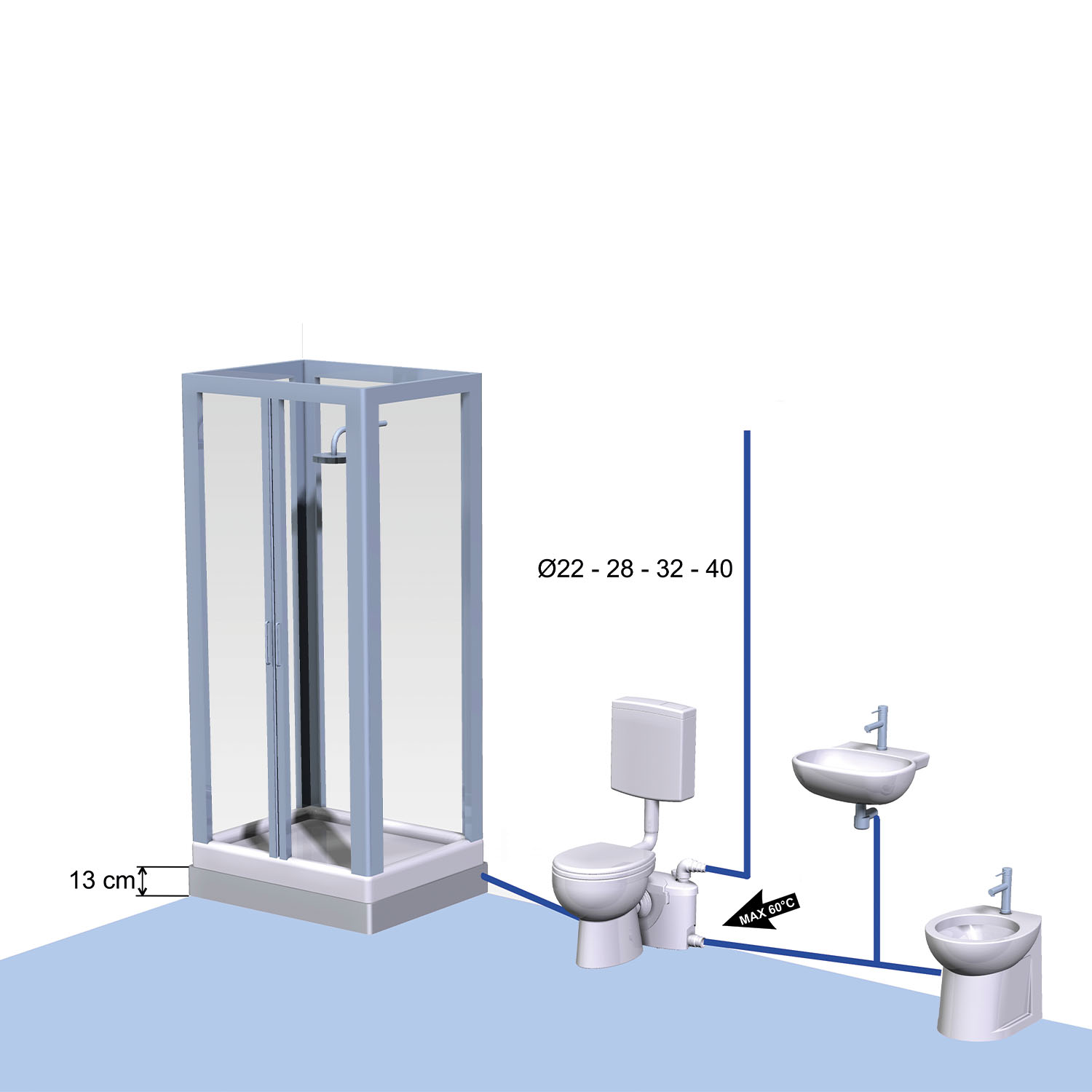 S-BASIC permette di creare un bagno supplementare anche lontano dal discendente fognario, evitando grossi interventi murari. È un maceratore con prestazioni elevate di triturazione e pompaggio, dotato di cestello filtro con lama rotante in acciaio inox e pompa separata. Il sistema consente lo scarico attraverso tubazioni di diametro contenuto (22/28/32/40 mm) e può essere collegato a un WC con scarico a parete; grazie alle connessioni supplementari è possibile collegare anche altre utenze del bagno, realizzando un bagno completo. È indicato anche per installazioni in cantina, case vacanza, hotel e strutture ricettive, e per adeguamenti di spazi destinati ad anziani o persone con disabilità.