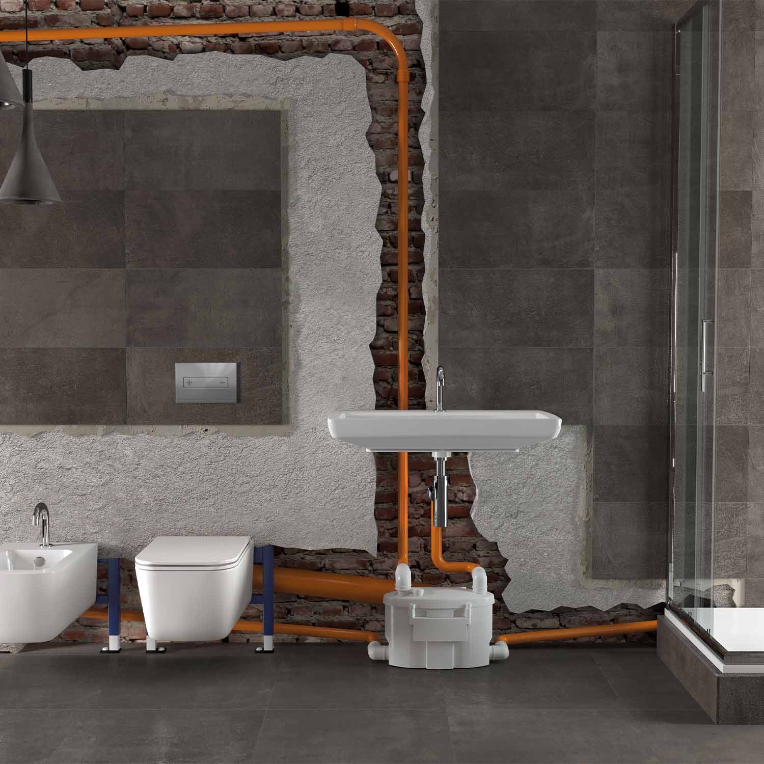 L’installazione delle cassette trituratrici è flessibile: la cassetta può essere collegata direttamente al WC oppure posizionata vicino ai sanitari e connessa tramite tubazioni. Questa seconda soluzione permette di realizzare un bagno completo e utilizzare qualsiasi tipo di WC, anche sospeso, mantenendo il trituratore accessibile. Se serve, può essere nascosto con una cover rivestibile per un risultato pulito a vista.